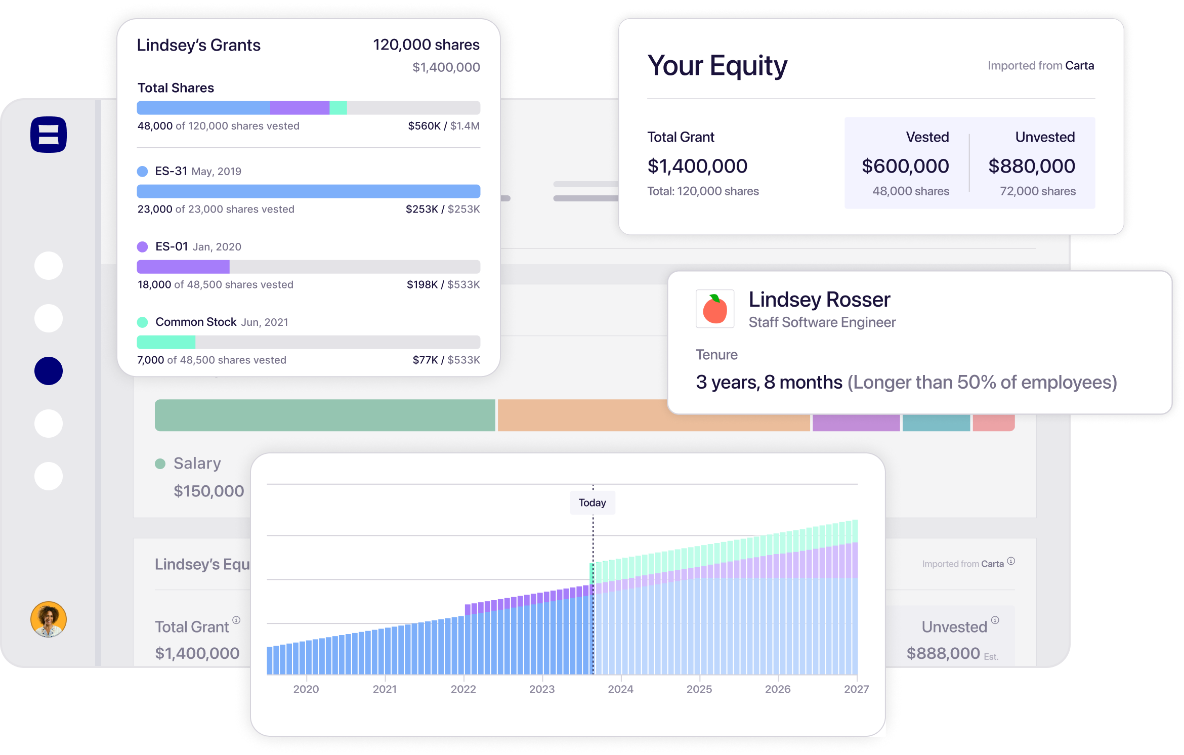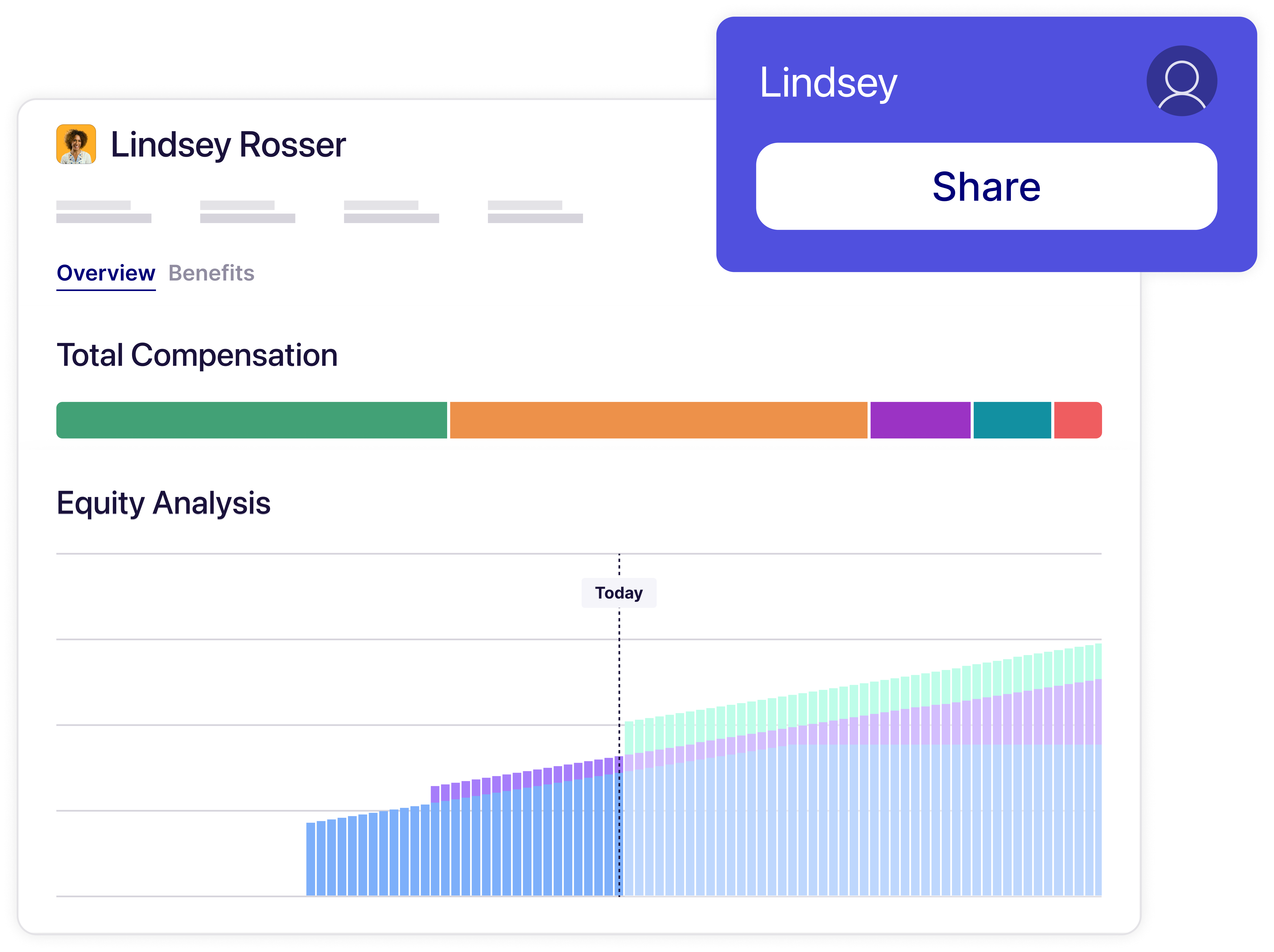 Admin View shows the full compensation package, including equity and vesting schedules, making compensation discussions more clear, boosting employee motivation, and highlighting issues that could lead to losing top talent.