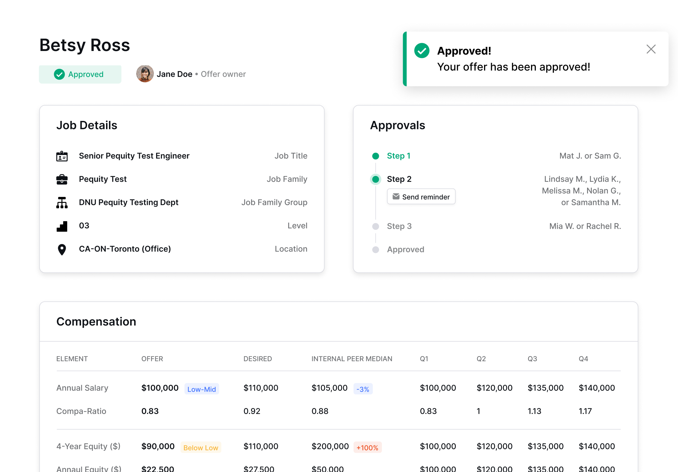 Stop switching between Slack, email, and spreadsheets. Pequity’s recruiter workbench has all the tools to help you make offers with confidence, keep managers informed, and closely monitor competitive market trends.